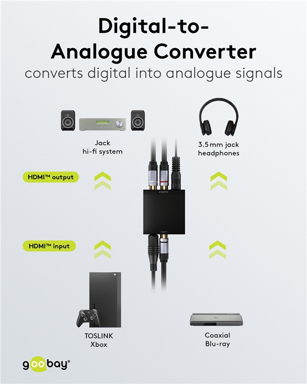 - Il convertitore D/A collega, ad es., una sorgente digitale come un lettore Blu-ray o una console di gioco con un'apparecchiatura analogica come un impianto stereo o una cuffia.