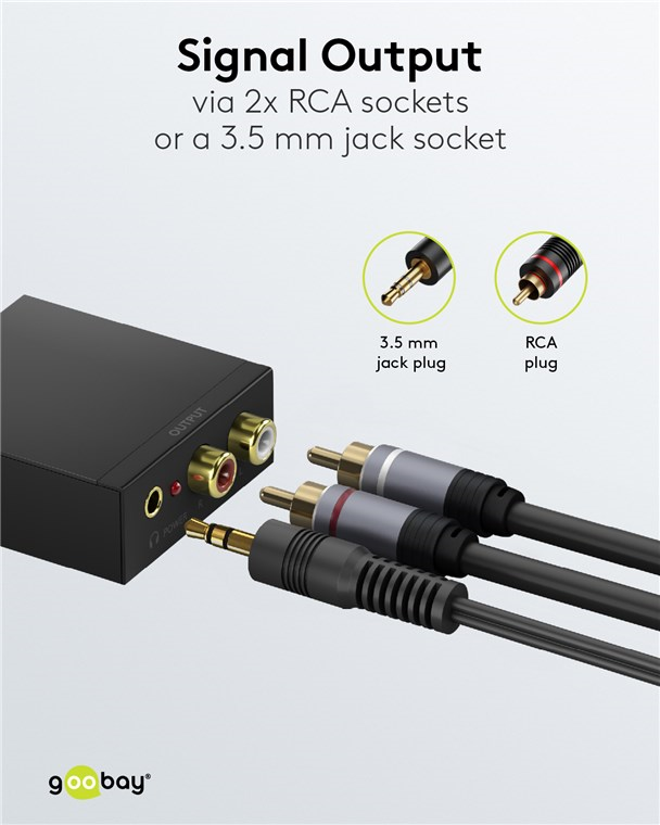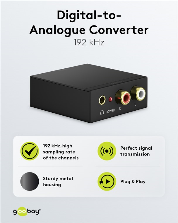 Il convertitore converte il segnale audio digitale in ingresso tramite cavo coassiale o TOSLINK e genera un segnale analogico di alta qualità che viene emesso tramite un connettore cinch/RCA o jack da 3,5 mm. Con 192 kHz, il convertitore D/A supporta una frequenza di campionamento dei canali relativamente elevata.