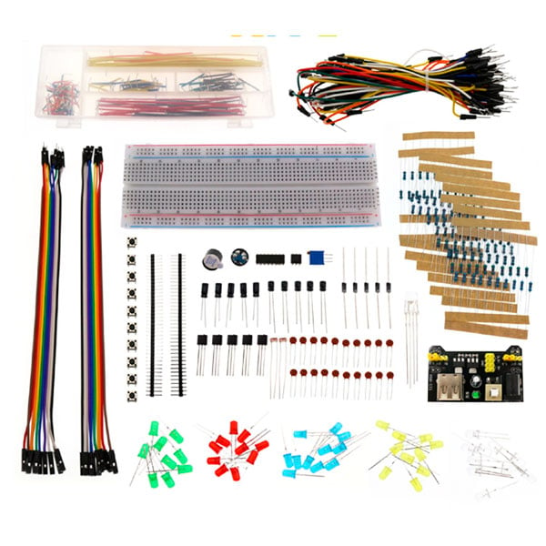 Confezione plastica contenente molti componenti elettronici per realizzare esperimenti con Arduino. La confezione comprende: