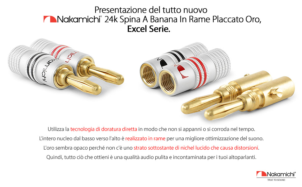 - ? Questo connettore a banana placcati in oro 24k della serie Excel utilizza la tecnologia di placcatura in oro diretta in modo che non si appanni o si corroda nel tempo. L'intero nucleo dal basso verso l'alto è realizzato in rame per una migliore ottimizzazione del suono.