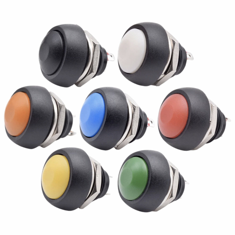 Attuatore: pulsante Colore: VARI COLORI Tipo contatti: SPST Portata: 1A@250V, 3A@125V N. poli: 1 Stati dei contatti: norm. aperto Tipo terminale: a saldare N. terminali: 2 Montaggio: pannello con dado Foro fissaggio: ø 12 mm