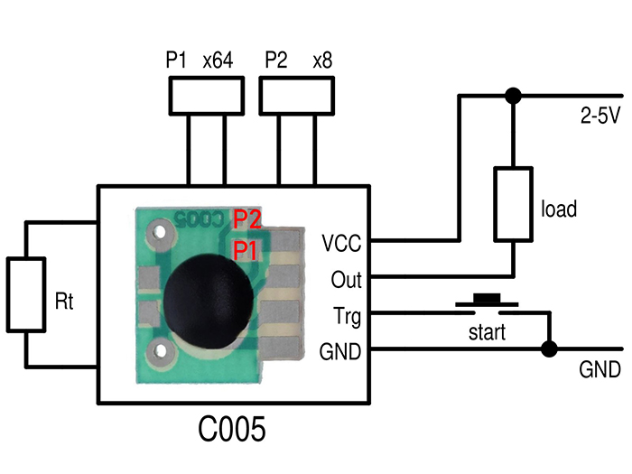 Il tempo di ritardo può essere impostato tra 2 secondi e 1000 ore utilizzando una sola resistenza e 2 moltiplicatori interni (P1 e P2).