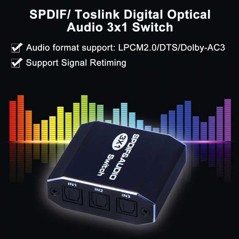 Questo interruttore Toslink three SPDIF (Toslink) segnale Audio ottico digitale a una uscita. Consente di collegare tre singole sorgenti audio ottiche, Come l'uscita di una console di gioco o di un lettore blu-ray, a un dispositivo, come un televisore e un ricevitore AV, O amplificatore. Fornire audio pulito e accurato, senza distorsione o interferenza del segnale. Distanza di trasmissione fino a 40m tramite cavo in fibra ottica che perde meno di 0.2db/m, frequenza di campionamento fino a 96 KHz . La protezione da sovratensione può prevenire i danni causati dal collegamento dell'adattatore di alimentazione senza pari alla macchina. Design in lega di alluminio: schermatura generale senza interferenze di segnale, garantisce un segnale audio di alta qualità;