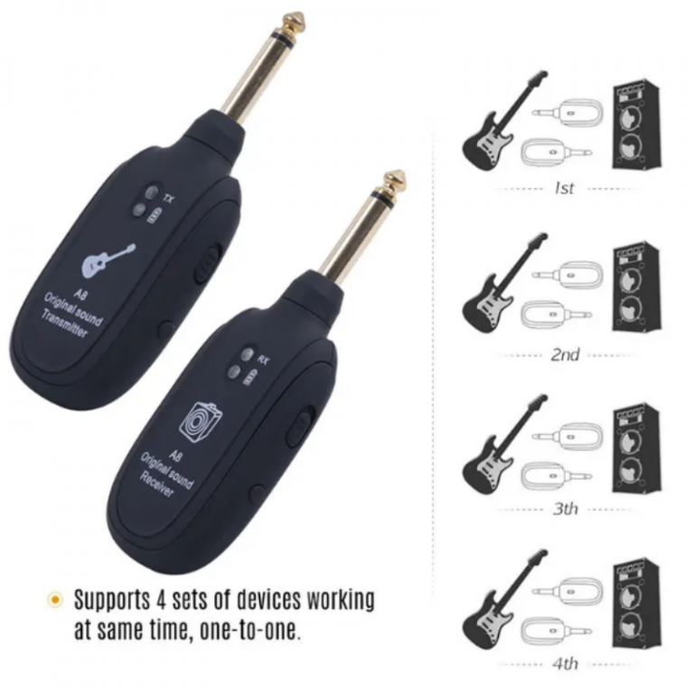 1. Il trasmettitore e ricevitore wireless possono essere utilizzati per strumenti elettroacustici come chitarra, basso, violino, ecc.