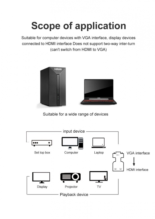 1. Viene utilizzato per convertire il video VGA e il segnale audio analogico da 3,5mm nel computer in un segnale compatibile con HDMI e visualizzarlo sul grande schermo dell'HDTV