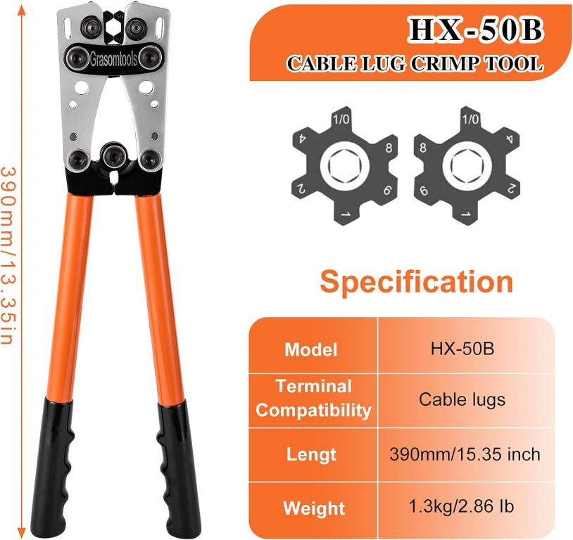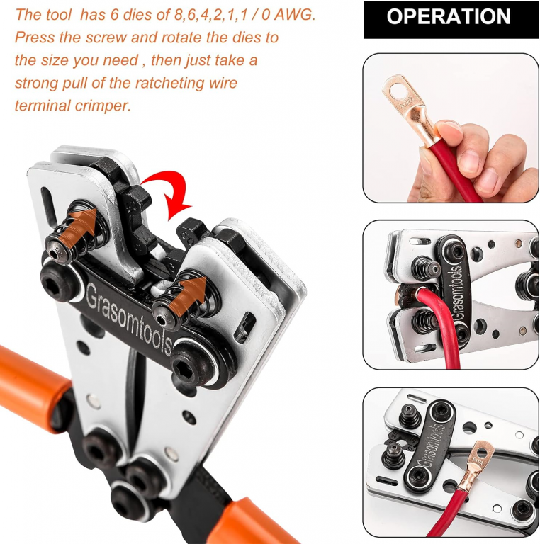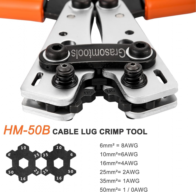 • MATRICI DI CRIMPATURA PRECISA: La pinza per capicorda della batteria è costituita da 6 matrici standard lavorate con Wire EDM Cutting per 10,8,6,4,2,0 (6mm²/10mm²/16mm²/25mm²/35mm²/50mm²), dotate di teste rotanti con un perno di bloccaggio caricato a molla per regolare le dimensioni.