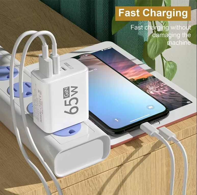 CARICABATTERIE USB RAPIDO DA MURO 65W CON USCITE USB-A TYPE-C PD (33W) NERO