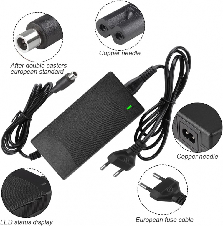 Questo caricabatterie dispone di 5 connettori diversi ed è adatto a scooter elettrici, scooter elettrici DC, monocicli, monopattini, monopattini a bilanciere.
