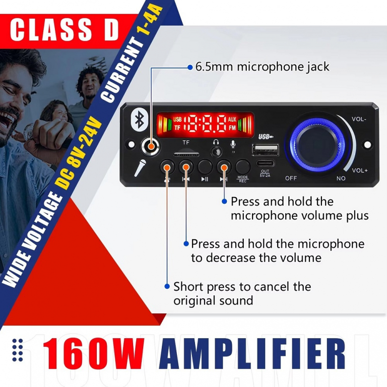DOTATO DI RICEVITORE BLUETOOTH IL QUALE PERMETTE DI ASCOLATE LA MUSICA COMODAMENTE IN MODALITA' WIRELESS, INCLUDE ANCHE LE SEGUENTI PRESE: