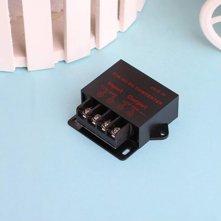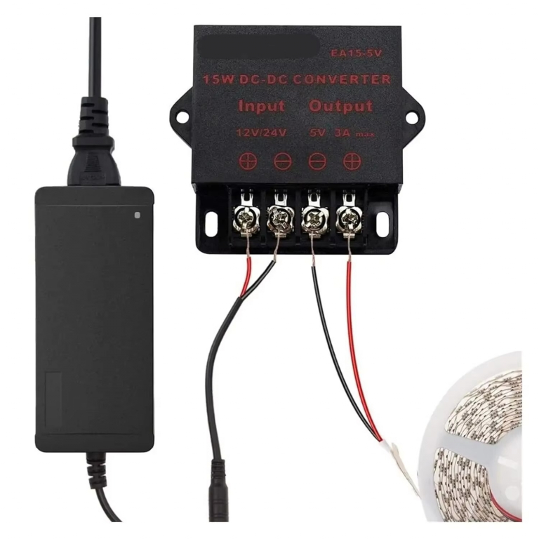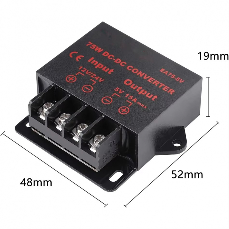 MODULO CONVERTITORE STEP DOWNTENSIONE IN INGRESSO: 12-24VDCTENSIONE IN USCITA: 5VCORRENTE MASSIMA: 5APOTENZA MASSIMA: 15WIL FISSAGGIO DEI CAVI AVVIENE TRAMITE MORSETTIERA A VITEDIMENSIONI: 4.8X5.2X1.9cm