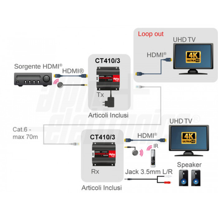 L'extender CT410/3 é adatto per estendere la lunghezza dei cavi HDMI utilizzando un solo cavo Cat.6/6A/7. In questo modo è possibile la trasmissione a distanze notevoli senza degradazione di segnale. E' la soluzione ideale per uso domestico e show rooms, applicazioni legate alla sicurezza, sale conferenza, scuole e ambienti di training.