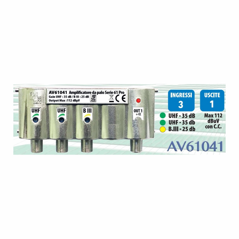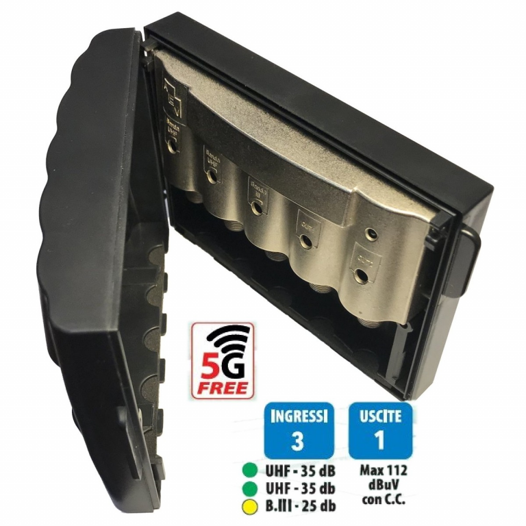 AMPLIFICATORE DA PALO PER ANTENNA TV 5G -112dBuV 3 INGR. UHF 35dB UHF 35dB B.III 25dB 1Out +cc
