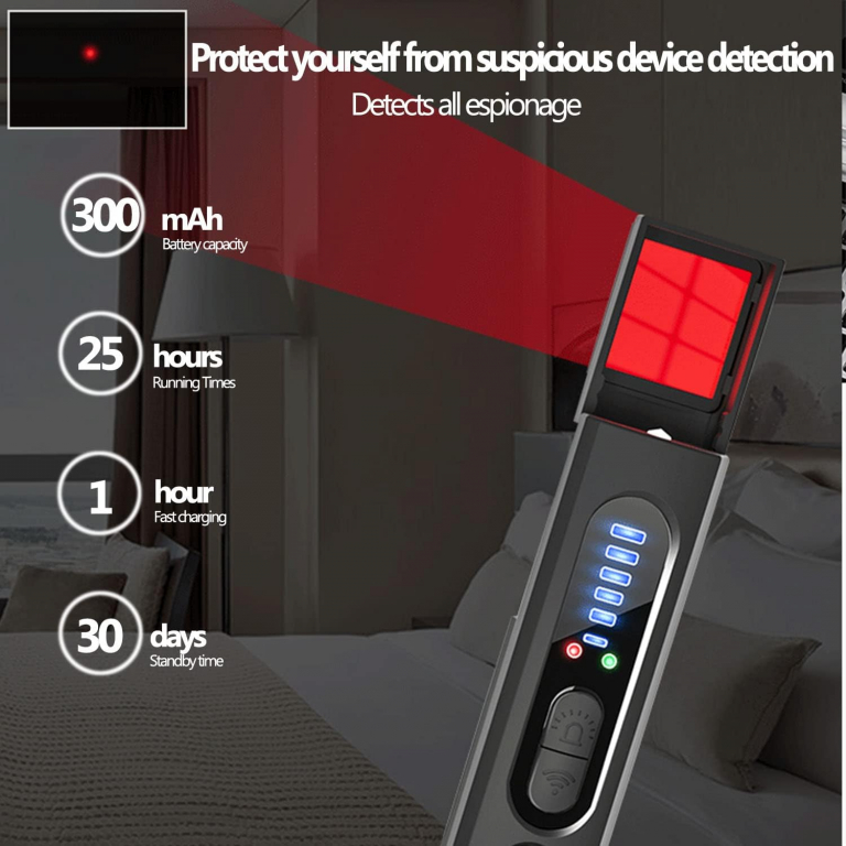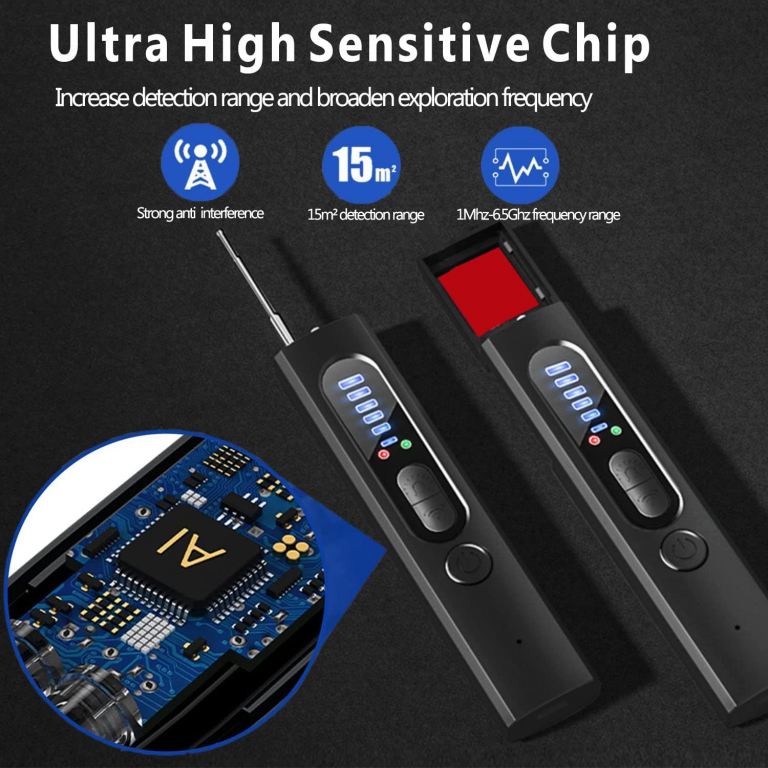 L'intervallo di frequenza di ricezione di questo rilevatore è compreso tra 1 Mhz e 6,5 Ghz. Pertanto, è in grado di rilevare rapidamente telecamere nascoste wireless, trasmettitori VHF/UHF, microspie/tracker GSM/3G/4G, sorgente di segnale wireless e forte segnale di campo magnetico,ecc.