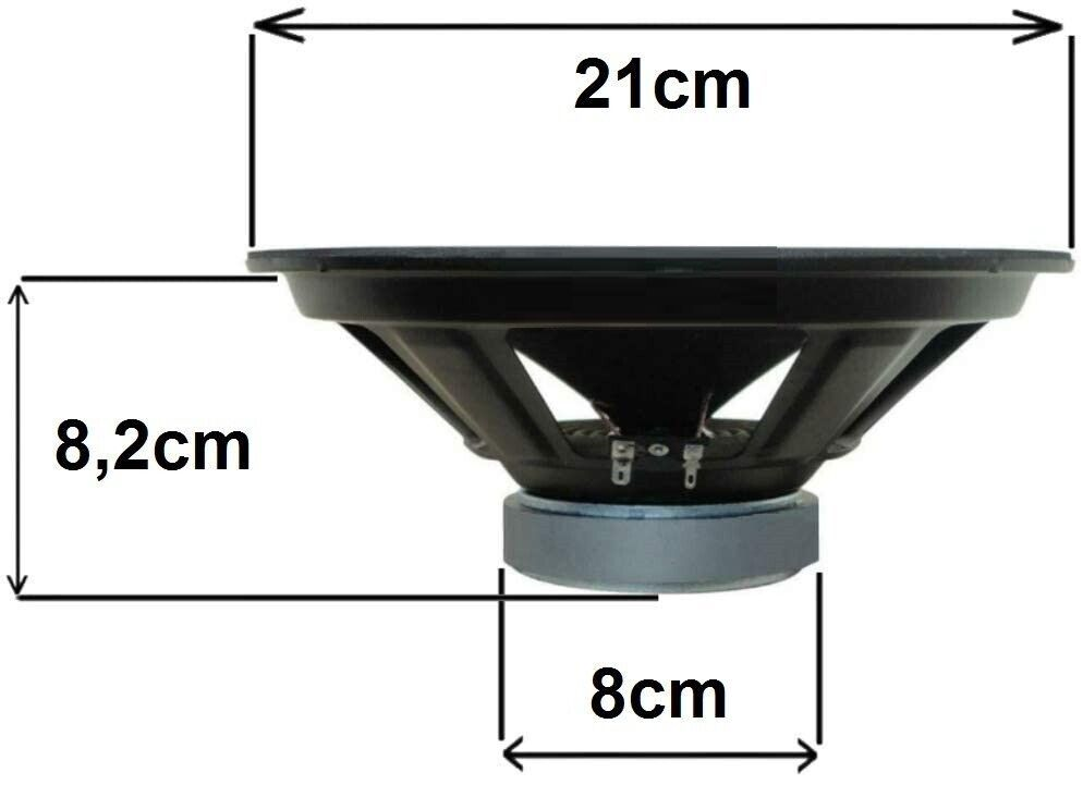 Potenza max.: 150WPotenza nominale (P): 75W RMSImpedenza: 8 Ohm Diametro: 210 mm Dimensione magnete: Ø 80mmProfondità di montaggio: 90mmDiametro foro: 180mm Distanza fori in diagonale: 200mm Distanza tra i fori: 75mm