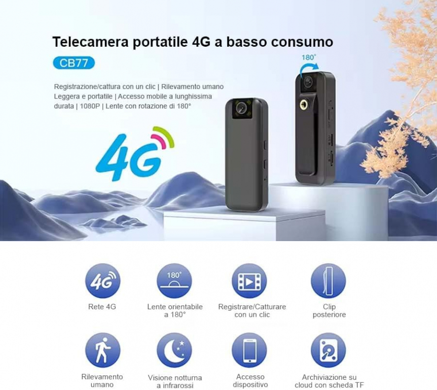 La mini telecamera con SIM 4G LTE garantisce un monitoraggio remoto ininterrotto, anche in aree prive di Wi-Fi. Completamente wireless e facile da installare basta accenderla ed è già operativa, è alimentata a batteria, il che la rende ideale per interni, esterni o veicoli. Compatta e portatile, offre una soluzione di sicurezza ovunque tu sia.