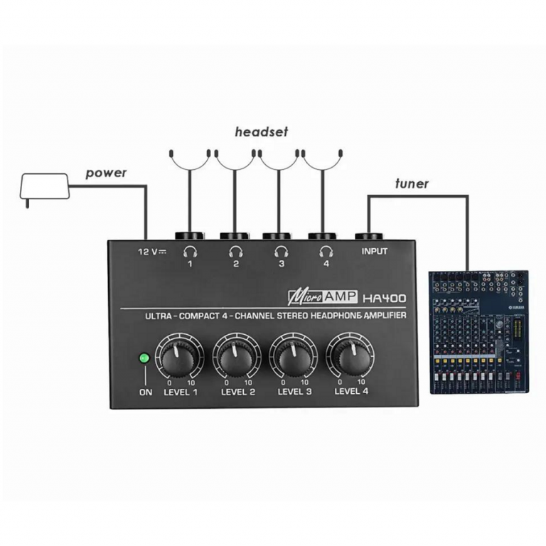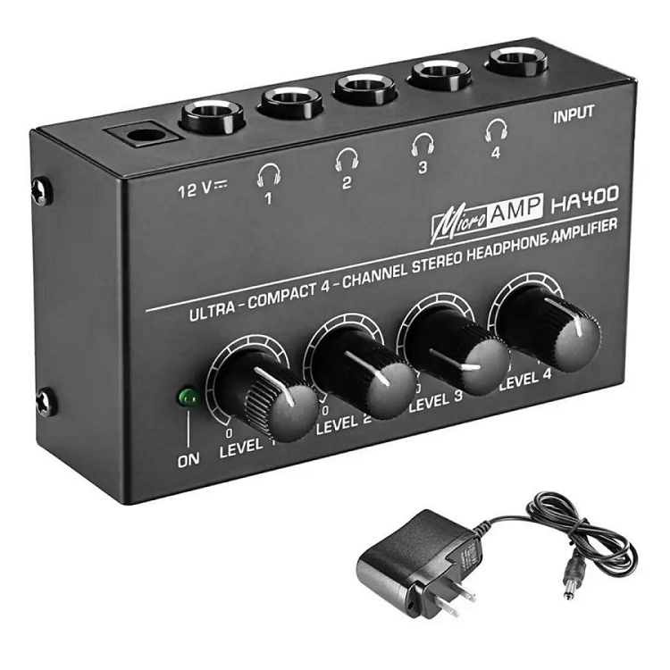 AMPLIFICATORE PER CUFFIA 4 CANALI (1 IN + 4 OUT) CON CONTROLLO VOLUME INDIPENDENTE. ALIMENTAZIONE 12VDC, ALIMENTATORE INCLUSO DIMENSIONI: 104X57X50mm IMPEDENZA IN USCITA: 65-80OHM