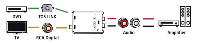 Mini Convertitore Audio Digitale/Analogico con ingressi Ottico/Toslink e coassiale. Converte i segnali audio digitali coassiali o Toslink in un segnale audio analogico L/R e può essere collegato a un dispositivo esterno tramite un cavo RCA