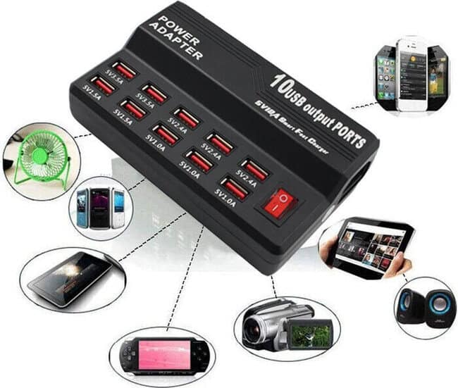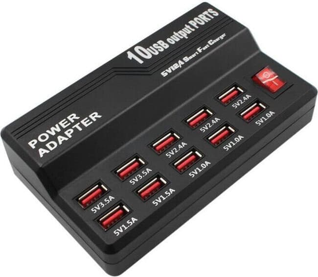CARICABATTERIA A 10 PORTE USB E INTERRUTTORE 5VDC 1-3,5A 60W