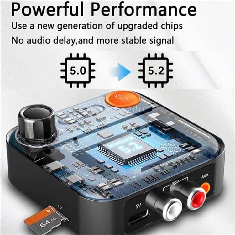Specifiche: Raggio di lavoro effettivo: 5m Standard Bluetooth: 5.2 Frequenza di funzionamento: 24.8MHz Velocità di trasmissione: 100Mbps Interfaccia: 3.5MM AUX, 2RCA, TF Codifica audio: SBC/AAC Protocollo Bluetooth: AVRCP/A2DP Risposta in frequenza: 20HZ-22KHz Dimensioni: 65.8x33.7x71mm