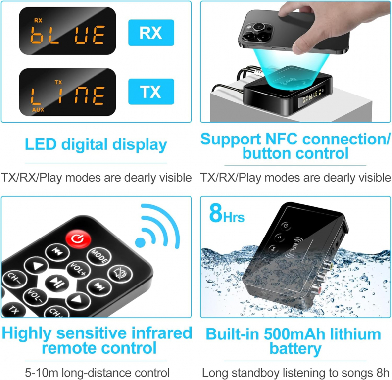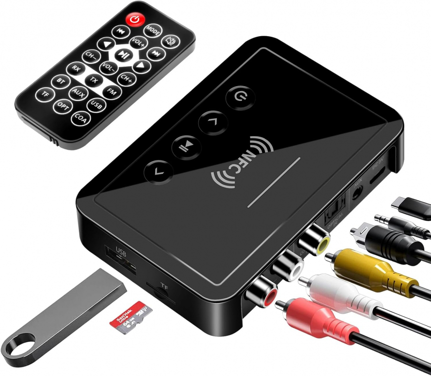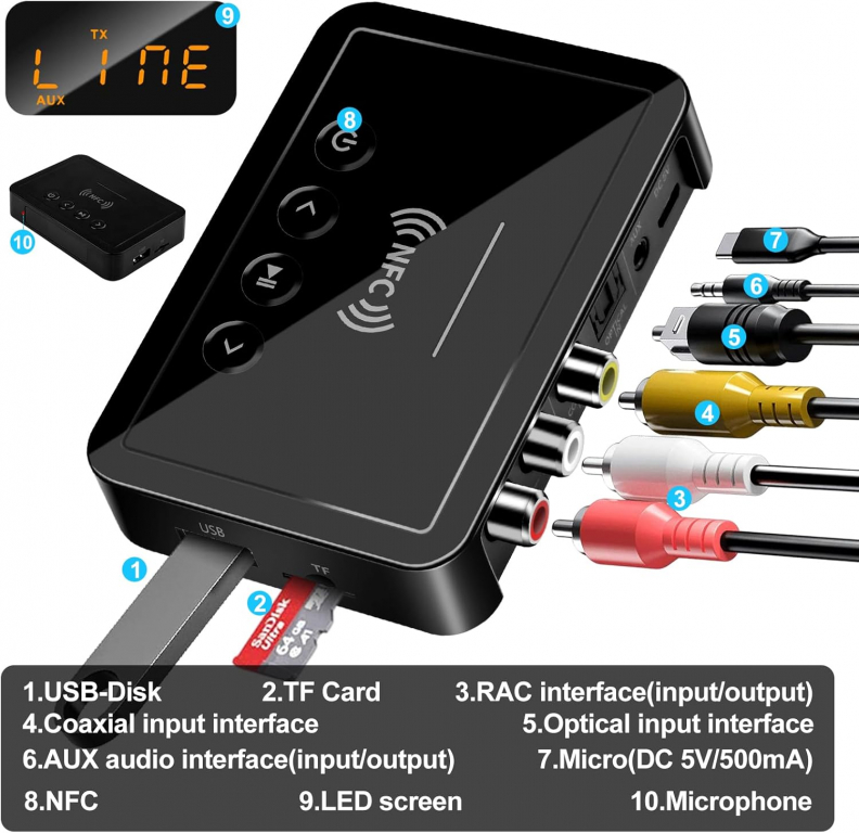 RICEVITORE TRASMETTITORE BLUETOOTH 5.0 DISPLAY USB TF INGR.TOSLINK COAX USCITA JACK 3,5 TELEC