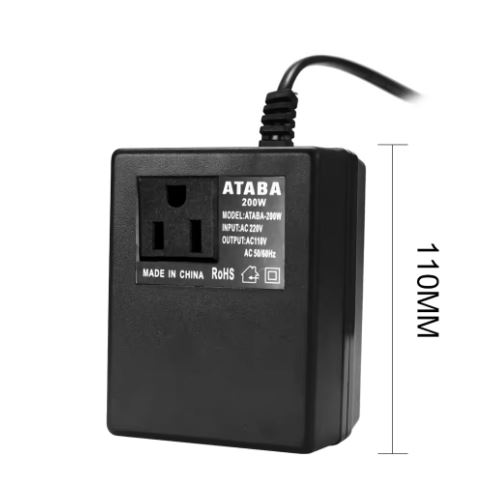 Potenza max 200WIngresso presa americana 3 pin, 220VACUscita spina bipolare 10A, 110VAC/120VACDimensioni articolo: 110x100x60mm