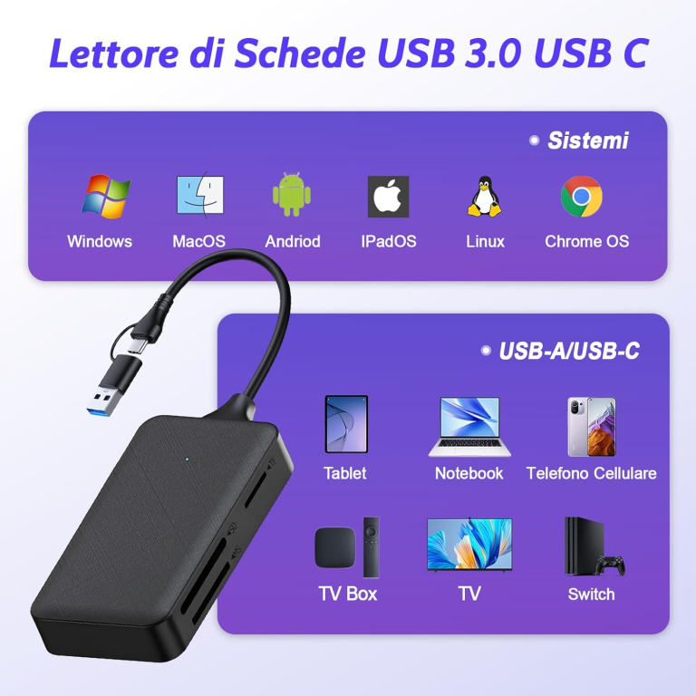 IL LETTORE SI COLLEGA TRAMITE UNA PORTA USB/A O TYPE-C ED E' COMPATIBILE CON TUTTI I PRODOTTI DOTATI APPUNTO DI PRESA USB