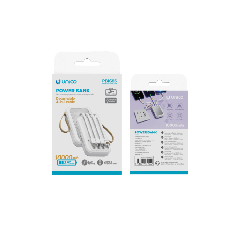 Batteria esterna con una capacità di 10000mAh e con 4 cavi collegati al corpo principale: USB/A, Type-C, MicroUSB, Lightning