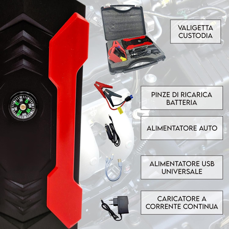 Avviatore di emergenza compatibile con tutti i tipi di auto, camper e moto.