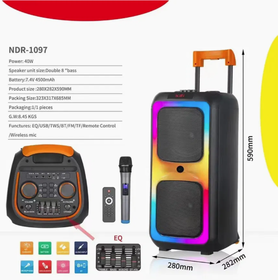 CASSA ATTIVA 2x8" RICARICABILE RGB BLUETOOTH FM AUX 2xMIC IN GUITAR IN REC USB MICRO SD MICROFONO TELECOMANDO