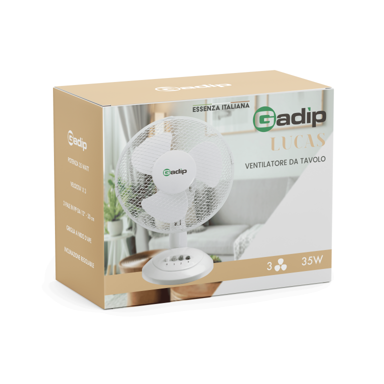 VENTILATORE DA TAVOLO POTENZA 35 WATT VELOCITA’ X 3 3 PALE IN PP DA 12” – 30 CM GRIGLIA A NIDO D’APE INCLINAZIONE REGOLABILE DIMENSIONI SCATOLA PRODOTTO: 38X34,5X16 CM