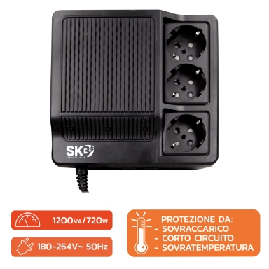 STABILIZZATORE TENSIONE RETE 230V SOPPRESSORE PICCHI E SOVRATENSIONI TEMPERATURA 1200VA 720W SKB