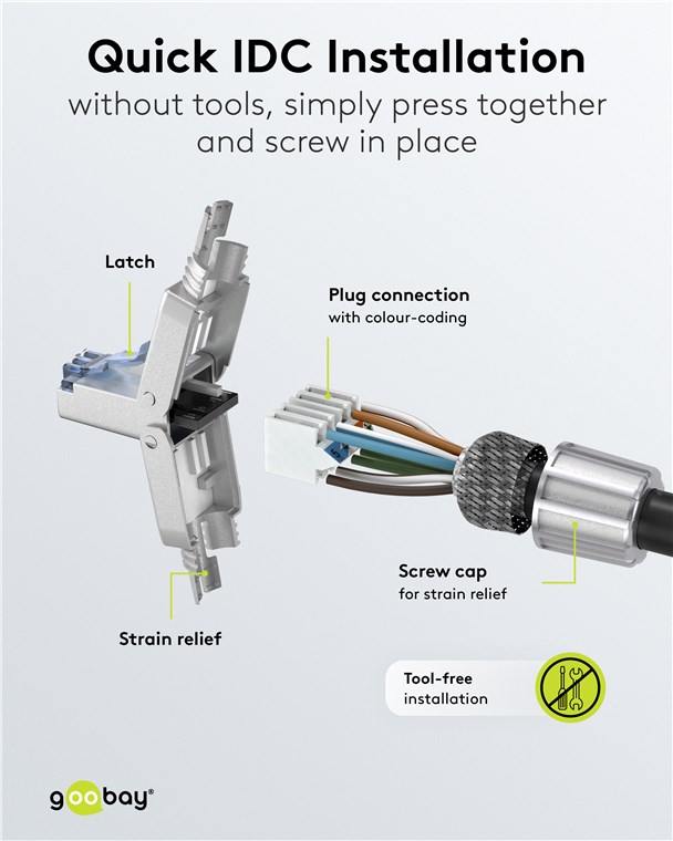 La spina RJ45 è facile da installare sul cavo CAT grazie al pratico meccanismo di piegatura. Grazie alla tecnologia di assemblaggio IDC, non sono necessari altri strumenti. È sufficiente posizionare i singoli fili sui contatti codificati per colore e fissarli in posizione premendo semplicemente l'alloggiamento del connettore.
