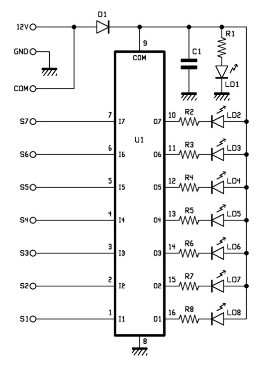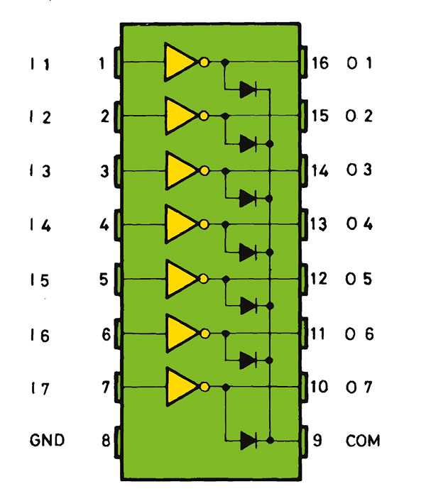 Il cuore del dispositivo è il circuito integrato ULN2003, un line-driver versatile e robusto. Ogni elettrodo è collegato a un ingresso del ULN2003 tramite un contatto che rimane isolato finché non viene toccato o sommerso dal liquido. Quando ciò avviene, il liquido funge da resistenza, consentendo il flusso di corrente dalla base del Darlington corrispondente all’interno del ULN2003. Questa commutazione attiva l’uscita corrispondente e accende il LED associato, indicando il livello raggiunto.