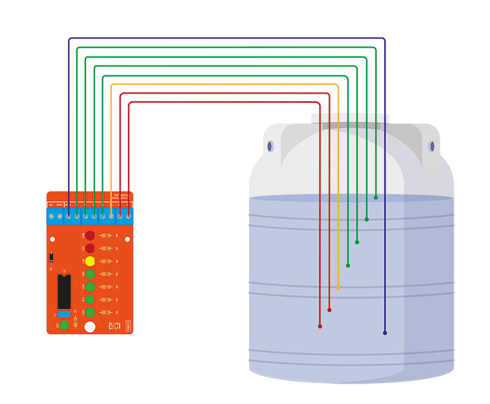 L’indicatore di livello di liquidi per serbatoi o cisterne può mostrare fino a sette LED accesi contemporaneamente, corrispondenti ai livelli di liquido raggiunti. È possibile considerare il massimo livello come punto di riferimento per la capacità massima della vasca.