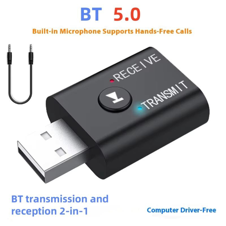 ADATTATORE USB CHE PUO' FUNZIONARE SIA DA RICEVITORE CHE DA TRASMETTITORE BLUETOOTH 5.0 L'AUDIO E' TRASMESSO TRAVITE CAVO AUX (INCLUSO) ALIMENTAZIONE DIRETTA TRAMITE SPINA USB