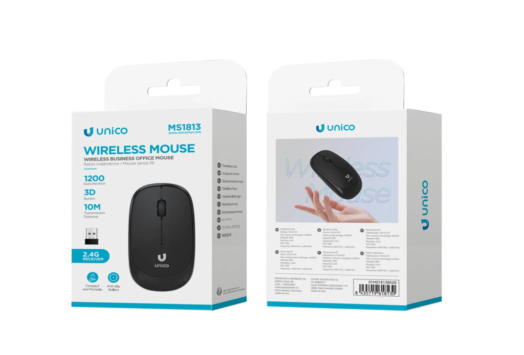 Mouse ottico con risoluzione 1200dpi operante in wireless grazie alla piccola ricevente USB in grado di catare fino a 10mt di distanza. Realizzato in colore nero presenta pulsanti soffici e silenziosi. Completamente plug&play non necessita di alcun driver.