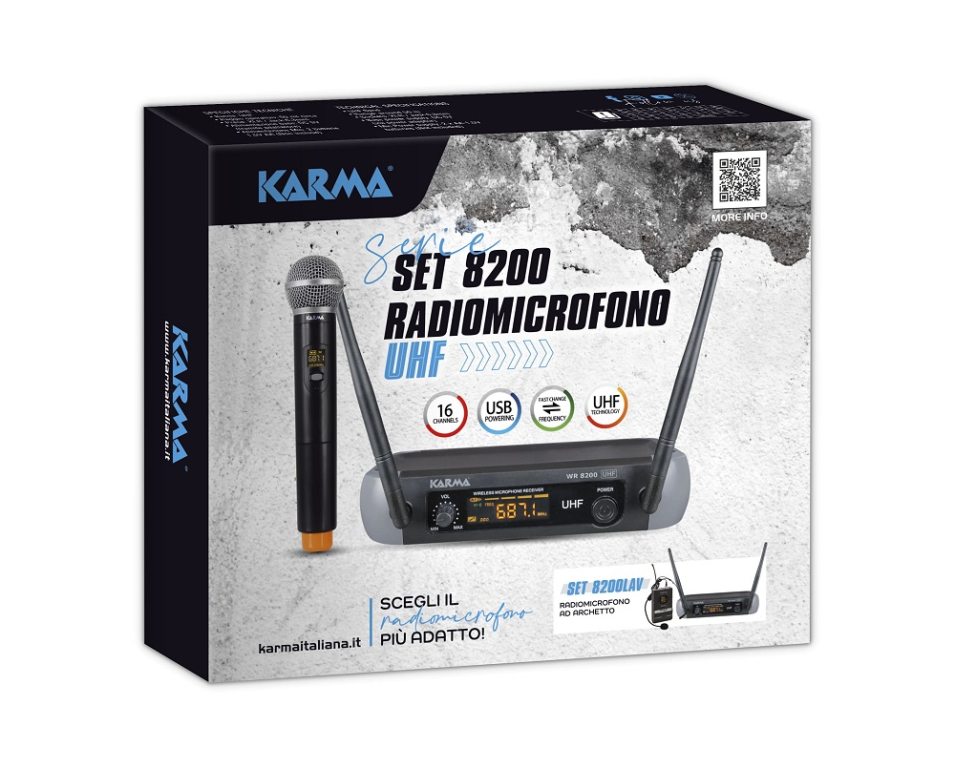 Radiomicrofono palmare operante in banda UHF. Sia il microfono che la base ricevente sono provvisti di display per il controllo della frequenza operativa e del livello di carica della batteria.