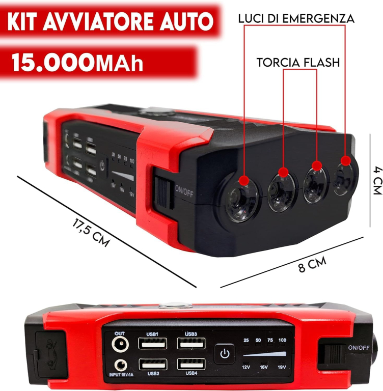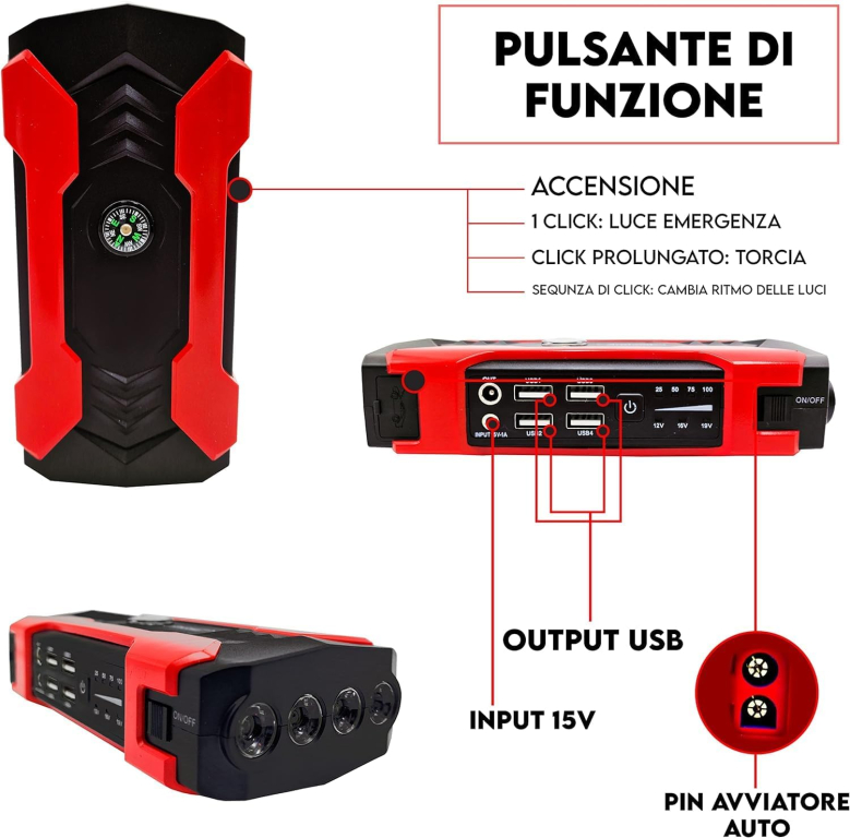 Avviatore di emergenza compatibile con tutti i tipi di auto, camper e moto.