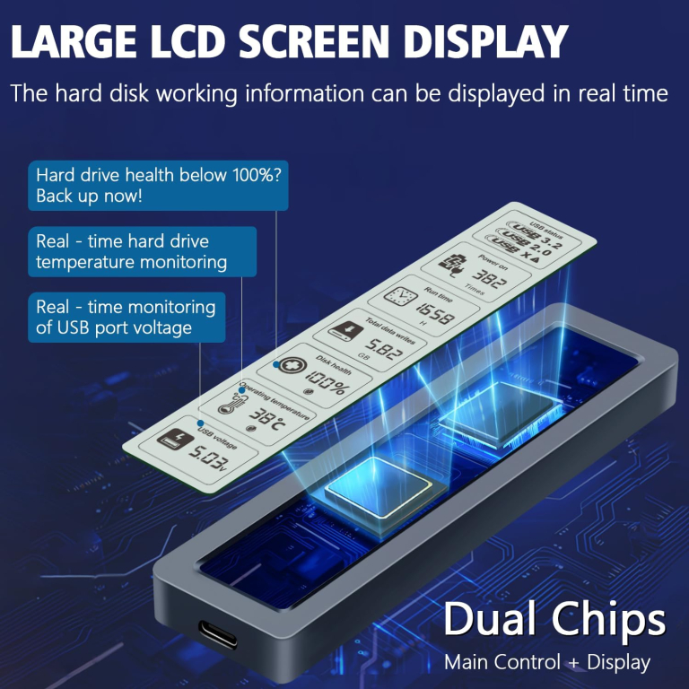 SMART CASE SSD M2 NVMe PCIe USB TYPE-C 3.2 10GBps DISPLAY TEMPERATURA CICLI TENSIONE MAX 8TB