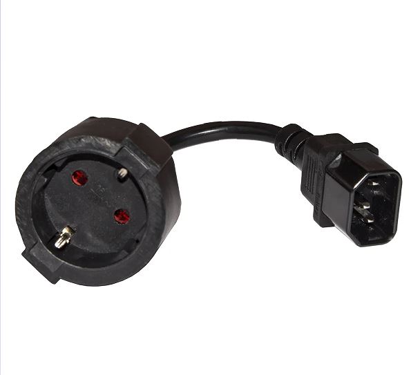 Tramite questo adattatore si può trasformare la spina C14 VDE in una presa Schuko tedesca 16A femmina, consentendo l'uso di un cavo con spina Schuko. Per esempio molti gruppi di continuità hanno la presa femmina IEC C13, tramite questo cavo gli si può collegare un cavo o un dispositivo con spina tedesca Schuko. La sua lunghezza permette ampia flessibilità di posizionamento. Connettore Schuko femmina - IEC C14 maschio. Specifiche cavo H05VV-F. Sezione dei conduttori 0,75 mm2