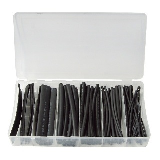 Assortimento 100 guaine termorestringenti NERE. Set comprende differenti taglie di guaine termorestringente. Lunghezza 100 mm., diametro 1,5 mm. (30 pz.), diametro 2,5 mm. (30 pz.), diametro 4 mm. (20 pz.), diametro 6 mm. (10 pz.), diametro 10 mm. (6 pz.), diametro 13 mm. (4 pz.). Temperatura di restringimento circa 120°C. Contrazione 2:1. Il set è consegnato in cofanetto con divisori, dimensione (LxPxA) 205 x 110 x 30 mm. Colore nere.
