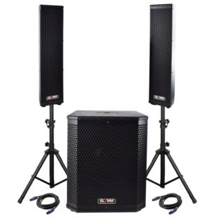 Sistema audio completo 2.1 composto da un subwoofer amplificato da oltre 600W con woofer da 12" e da due speaker satelliti ognuno con 4 altoparlanti a 2 vie in grado di riprodurre una potenza massima di 150W l'una. Il woofer è amplificato e fornisce il segnale ai due satelliti tramite cavi speakon in dotazione. L'amplificatore monta un modulo MP3 avanzato con display LCD grafico e possibilità di gestire MP3, radio e segnali bluetooth provenienti da smartphone o tablet.