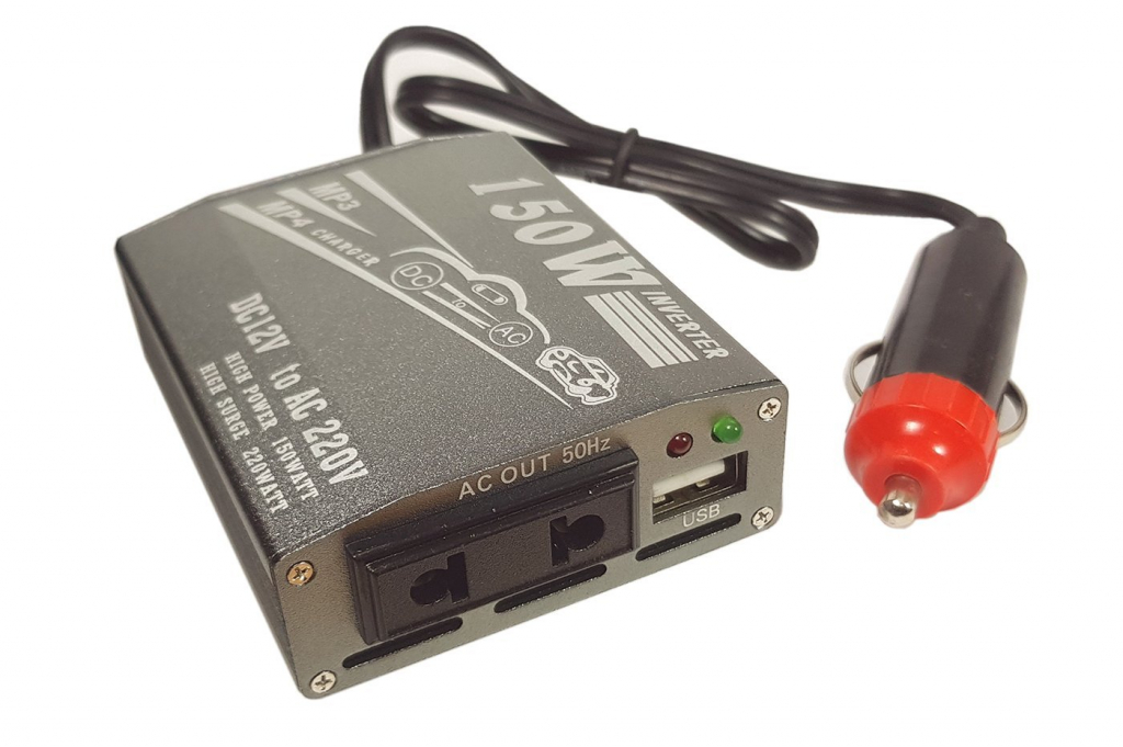 Inverter da 150W che si collega direttamente alla presa dell'accendisigari dell'auto e che consente di alimentare la maggior parte  dei  dispositivi elettronici che vengono abitualmente alimentati con la rete elettrica domestica 220V. Possiamo quindi ricaricare  smartphone, tablet, fotocamere, videocamere, PC portatili, ecc. o comunque apparecchi che non superano i 150 w di assorbimento.