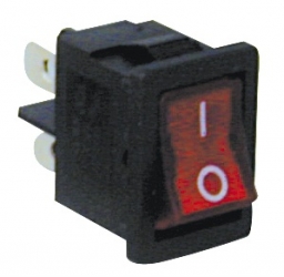 Mini interruttore a bilancere da pannello luminoso ON-OFF. Interruttore 2 poli (4 contatti, 2 x normalmente aperti), 2 posizioni (ON-OFF). Serigrafia I/O. Portata 250V AC / 3A (125V AC / 6A). Modello plastica nera con fissaggio ad incasso., interruttore luminoso rosso. Dimensioni (LxL) 19 x 12,5 mm., profondità 23 mm. Terminali a faston 4,8 mm
