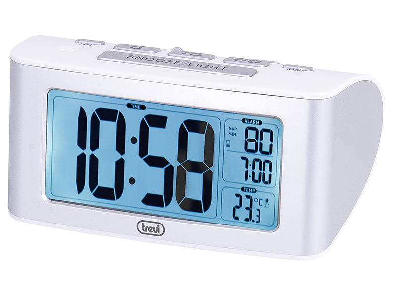 Il comodo dispaly LCD dell'orologio digitale Trevi permette con una sola occhiata di avere una panoramica completa su che ore sono e quanto manca alla sveglia. La retroilluminazione, attivabile con un semplice tocco, lo rende facilmente consultabile anche di notte. Le funzioni di regolazione della sveglia e del timer sono veloci e facilitate da appositi pulsanti.