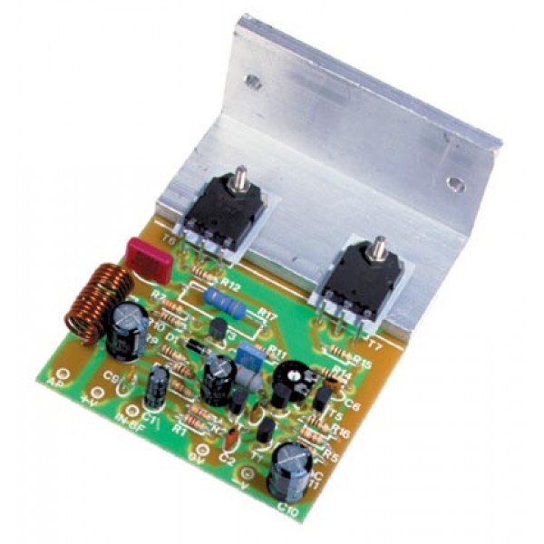 Compatto modulo HI-FI a mosfet in grado di erogare una potenza di 100 watt su 8 ohm e di 150 watt su 4 ohm con una tensione di alimentazione duale di 50 volt per ramo. Il modulo, che utilizza una coppia di mosfet Hitachi, presenta una distorsione inferiore allo 0,1 per cento ed una banda passante compresa tra 5 e 80.000 Hz. Il kit comprende il dissipatore a "L". Per un funzionamento continuo alla massima potenza, il modulo deve essere fissato a un dissipatore a barra adatto a 1 o 2 moduli. Dimensioni c.s.: 100 x 75 x 43 mm.