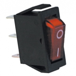 Interruttore a bilancere da pannello luminoso ON-OFF. Interruttore 1 poli (2 contatti di commutazione, 1 x normalmente aperto, 1 x contatto luce), 2 posizioni (ON-OFF). Serigrafia I/O. Portata 250V AC 15A (125V AC / 20A). Modello plastica nera con fissaggio ad incasso, interruttore luminoso rosso. Dimensioni (LxL) 27 x 10,5 mm., profondità 29 mm. Terminali a faston 6,3 mm