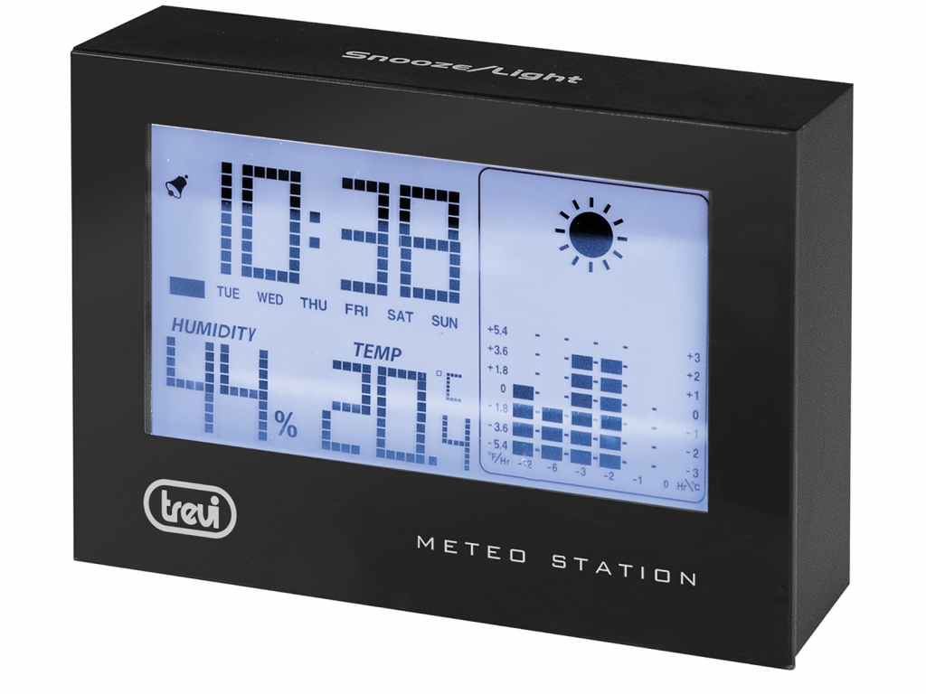La Mini Stazione Meteo TREVI ME 3103 è un dispositivo dal design semplice e pulito, molto giovanile e che, pur presentandosi con uno stile moderno, può adattarsi a qualsiasi arredamento senza alcun problema. La Mini Stazione Meteo mostra tante informazioni sul suo ampio display. E' proprio grazie a questa caratteristica che tutti i dati forniti dal dispositivo si leggono con estrema facilità. La funzionalità di sveglia con suoneria programmabile e la grafica semplice ed intuitiva completano la sua praticità ed efficienza. È più che un semplice orologio o sveglia da comodino, stiamo parlando di una vera e propria mini stazione meteo che non si limiterà a svolgere solo questo compito. Grazie al termometro e all'igrometro digitale incorporato potrai visualizzare, tramite il display retroilluminato, dati riguardanti la temperatura delle precedenti 12 ore. La Mini Stazione Meteo TREVI ME 3103 ti aiuterà tutta la giornata. Affrettati e comincia subito ad utilizzarla!La Mini Stazione Meteo TREVI ME 3103 è un dispositivo dal design semplice e pulito, molto giovanile e che, pur presentandosi con uno stile moderno, può adattarsi a qualsiasi arredamento senza alcun problema. La Mini Stazione Meteo mostra tante informazioni sul suo ampio display. E' proprio grazie a questa caratteristica che tutti i dati forniti dal dispositivo si leggono con estrema facilità. La funzionalità di sveglia con suoneria programmabile e la grafica semplice ed intuitiva completano la sua praticità ed efficienza. È più che un semplice orologio o sveglia da comodino, stiamo parlando di una vera e propria mini stazione meteo che non si limiterà a svolgere solo questo compito. Grazie al termometro e all'igrometro digitale incorporato potrai visualizzare, tramite il display retroilluminato, dati riguardanti la temperatura delle precedenti 12 ore. La Mini Stazione Meteo TREVI ME 3103 ti aiuterà tutta la giornata. Affrettati e comincia subito ad utilizzarla!